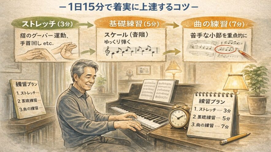 1日15分を毎日続けるのがおすすめです。「週末にまとめて2時間」よりも「毎日15分」の方が脳の記憶定着には効果的です。もちろん余裕がある日は30分、1時間と延ばしてもOKですが、最低ラインを15分に設定しておくことで「今日は疲れたけど15分だけなら」と続けやすくなります。大切なのは「毎日鍵盤に触る」習慣を作ることです。