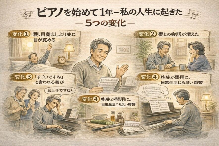 退職後、妻との会話は「ご飯何にする?」「明日の天気は?」くらいしかなかった日々が、ピアノを始めてから一変しました。