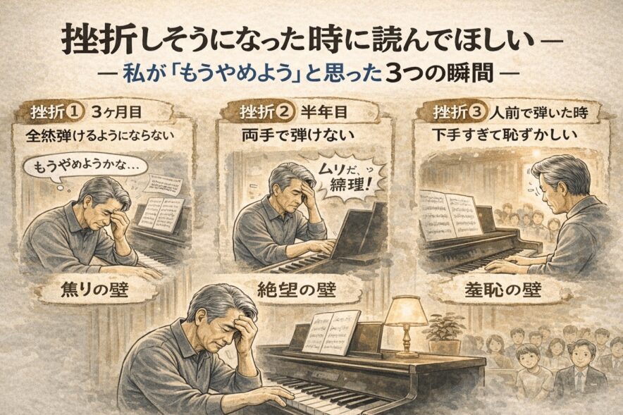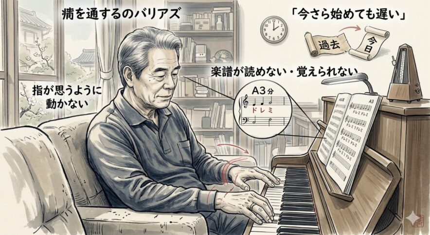 - 「指の硬さ」「楽譜が読めない」「今さら遅い」という3つの壁は、すべて具体的な対処法で乗り越えられる