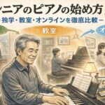シニアの初心者には、まずピアノ教室をおすすめします。正しいフォームが身につくこと、わからないことをすぐ質問できること、仲間ができること、発表会というモチベーションがあること。これらのメリットは独学では得られません。ただし「通うのが難しい」「人前で弾くのが恥ずかしい」という方は、DVD付き教材やオンラインレッスンから始めるのもよい選択です。